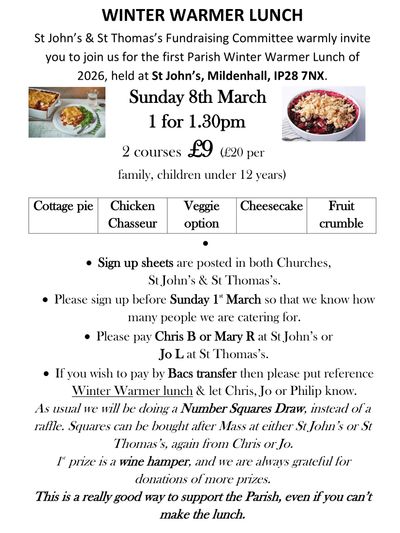 If you have already entered your name and food choice to the sign up sheet at St. Thomas, please can you email your name and food choices again to parishwebeditor@yahoo.com as regretabbly the form has been removed from our notice board, or add your details again to the replacement sign up sheet which is now in place in the Narthex at St.Thomas Church.